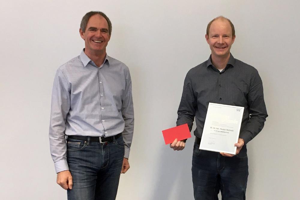 „Ich bin sehr froh, mit Thomas Hochrein einen so exzellenten Wissenschaftler, aber auch angenehmen Kollegen am SKZ zu haben“, sagt Institutsdirektor Prof. Dr.-Ing. Martin Bastian, der dem nebenberuflichen und passionierten Bergführer Hochrein die Jubiläums-Urkunde sowie einen kleinen Bergausrüstungsgutschein überreichte. Und die nächsten 15 Jahre? Für die Zukunft wünsche er sich, dass sich das SKZ weiterhin so gut entwickle und seinen Stand in der Branche als Wegbereiter behaupte, sagt Hochrein. „Außerdem ist es mir ein wichtiges Anliegen, dass wir unser gesellschaftliches Engagement – wie etwa unsere Schülerlabore – weiter ausbauen und klimaneutral werden. Und ich hoffe sehr, dass wir trotz Wachstum den inneren Zusammenhalt bewahren und stärken können – denn genau der macht das SKZ und die Arbeit am SKZ aus,“ sagt er abschließend.