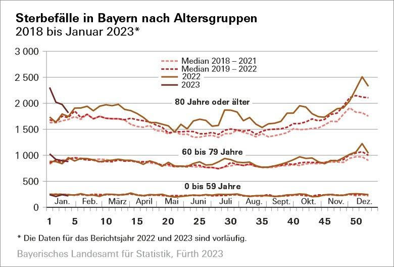 Wie das Expertenteam des Bayerischen Landesamts für Statistik nach Auswertung vorläufiger Daten weiter mitteilt, liegt die Zahl an Verstorbenen im Freistaat im Januar 2023 mit 14 086 Personen insgesamt mehr als zwölf Prozent über dem Niveau des Medians der Jahre 2019 bis 2022 (12 550 Verstorbene). Dabei verzeichnet das Bayerische Landesamt für Statistik bei Personen unter 60 Jahren einen Rückgang der Sterbefälle um etwa sieben Prozent. Bei den 80-Jährigen und Älteren liegen die Sterbefallzahlen ca. 19 Prozent über dem Median der Jahre 2019 bis 2022.