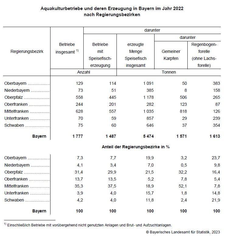 Im Jahr 2022 beläuft sich die Speisefischerzeugung der bayerischen Aquakultur-betriebe auf rund 5 474 Tonnen Speisefisch, 2,6 Prozent mehr als im Jahr zuvor. Davon entfallen 29,5 Prozent auf die Regenbogenforelle (1 613 Tonnen) und 27,7 Prozent auf den Gemeinen Karpfen (1 570 Tonnen). Die großen Aquakulturbetriebe mit mehr als 5 Tonnen jährlicher Fischproduktion stehen im Jahr 2022 für nur 12,2 Prozent aller bayerischen Aquakulturbetriebe, produzieren aber gut vier Fünftel (81,5 Prozent) der Speisefischmenge.