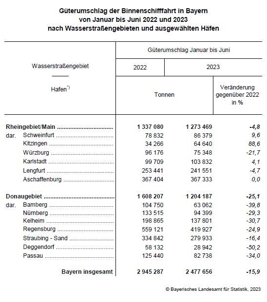 Der Güterumschlag an der Donau liegt mit einer Abnahme um 25,1 Prozent bei 1,20 Millionen Tonnen. Das entspricht einem Anteil von 48,6 Prozent am Gesamtumschlag Bayerns. Im Maingebiet, das einen Anteil von 51,4 Prozent am Gesamtumschlag hat, sinkt der Güterumschlag von Januar bis Juni 2023 um 4,8 Prozent auf 1,27 Millionen Tonnen. Die umschlagstärksten Häfen sind Regensburg mit knapp 420 000 Tonnen und Aschaffenburg mit gut 367 000 Tonnen.