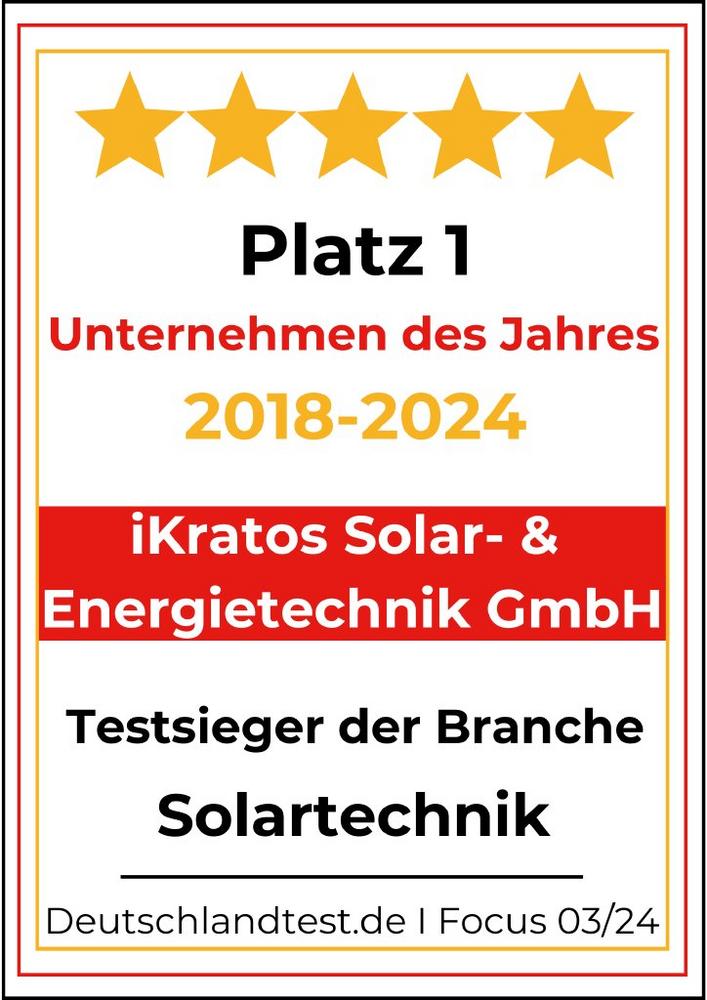 Die Firma iKratos Solar- und Energietechnik GmbH aus dem oberfränkischen Weißenohe wurde von Focus Money wieder mit dem Siegel "Unternehmen des Jahres 2024" ausgezeichnet.