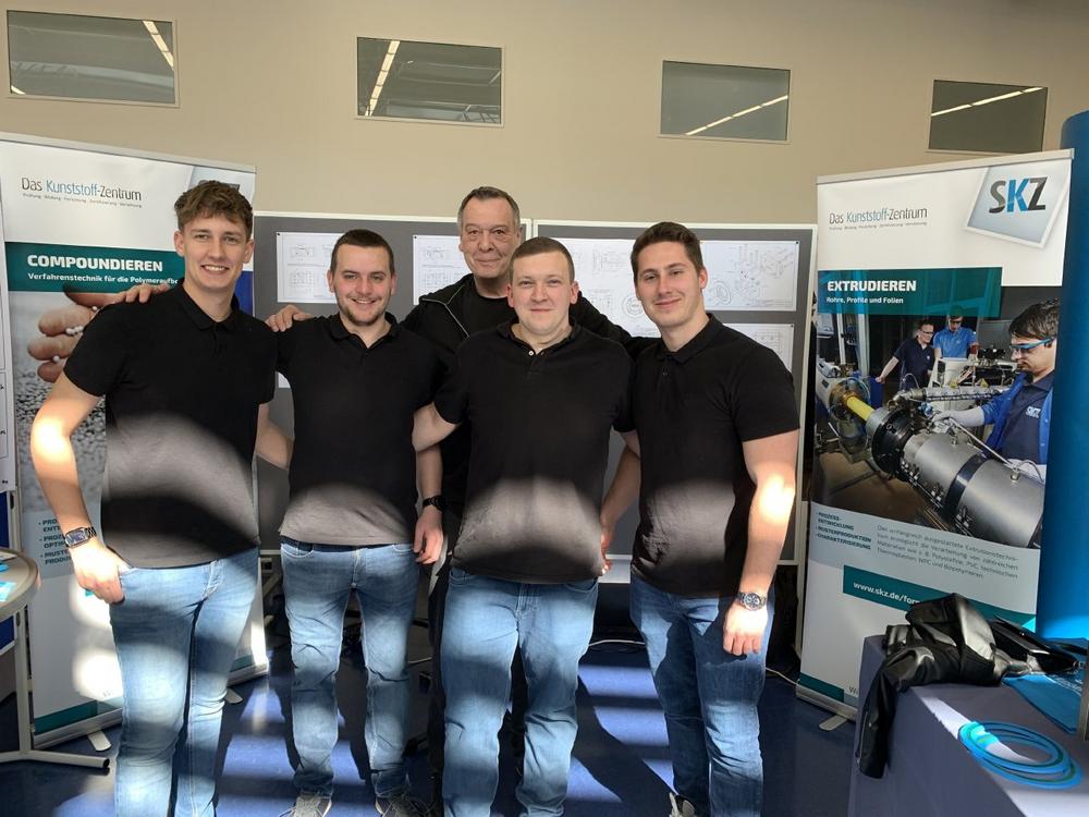 Die Auslegung von Extrusionswerkzeugen ist eine anspruchsvolle Aufgabenstellung. Vier angehende Techniker der Franz-Oberthür-Schule haben diese Herausforderung angenommen und in Zusammenarbeit mit ihrem Betreuer Kersten Kurda, Technischer Leiter und Berater bei Industrieprojekten im Bereich Materialien, Compoundieren, Extrudieren am SKZ, eine Extrusionsdüse entworfen und konstruiert.