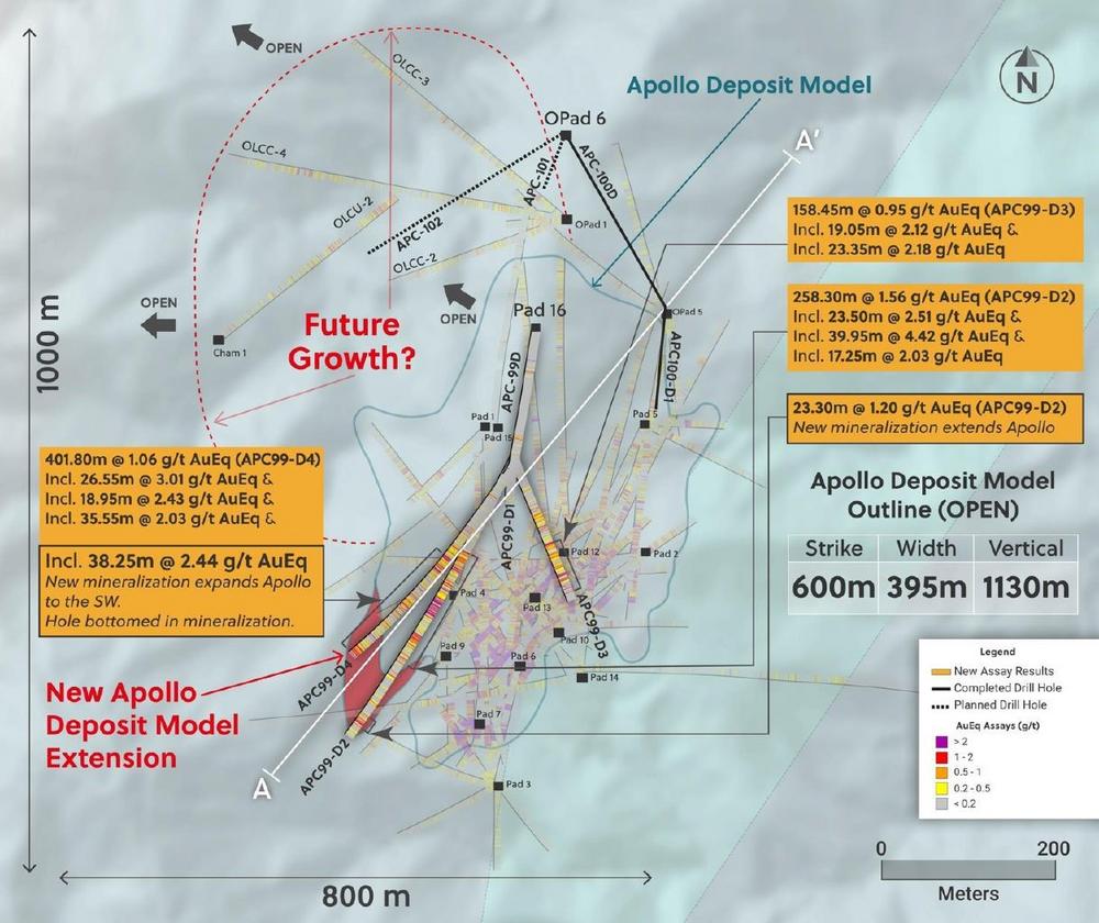 – 401,80 Meter @ 1,06 g/t Goldäquivalent aus 369,00 Metern (APC99-D4) einschließlich:
