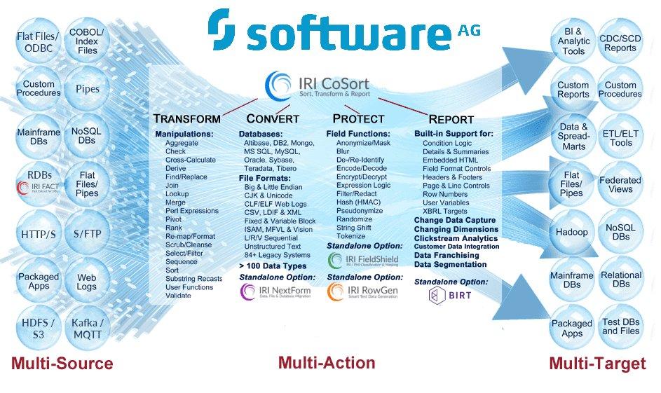Leistungsstarke Tools für verbesserte Datenverarbeitung und Schutz: IRI CoSort bietet eine leistungsstarke Plug-and-Play-Sortierbibliothek für Natural-Benutzer unter Unix, die bis zu sechsmal schneller sortiert als die native Funktion. Das SortCL-Programm von CoSort kann direkt aus Natural aufgerufen werden und bietet erweiterte Flexibilität bei der Dateiverarbeitung. Zusätzlich kann CoSort in die von Tetrad Systems entwickelte Legacy-Anwendungsumgebung "Operational Processing for Unix" (OPX) integriert werden. Die metadatenfähigen Produkte IRI NextForm und IRI FieldShield bieten Lösungen für Datenmigration, Replikation, Datenmaskierung und Datenschutz auf Feldebene.
