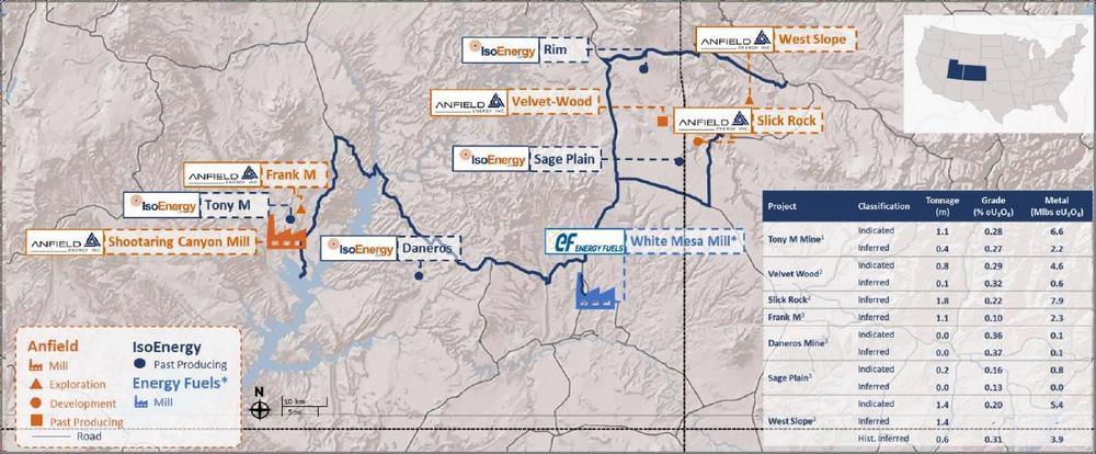 IsoEnergy Ltd. ("IsoEnergy") (TSX: ISO; OTCQX: ISENF) – https://www.commodity-tv.com/ondemand/companies/profil/isoenergy-ltd/ – und Anfield Energy Inc. ("Anfield") (TSX.V: AEC; OTCQB: ANLDF; FRANKFURT: 0AD) freuen sich, bekannt zu geben, dass sie eine endgültige Vereinbarung (die "Arrangement-Vereinbarung") abgeschlossen haben, gemäß der IsoEnergy alle ausgegebenen und ausstehenden Stammaktien von Anfield (die "Anfield-Aktien") im Rahmen eines gerichtlich genehmigten Arrangement-Plans (die "Transaktion") erwerben wird. Anfield besitzt 100 % der Shootaring Canyon Mill (die "Mühle") im Südosten von Utah, USA, eine von nur drei lizenzierten, genehmigten und gebauten konventionellen Uranmühlen in den Vereinigten Staaten, sowie ein Portfolio an konventionellen Uran- und Vanadiumprojekten in Utah, Colorado, New Mexico und Arizona (Abbildung 1).