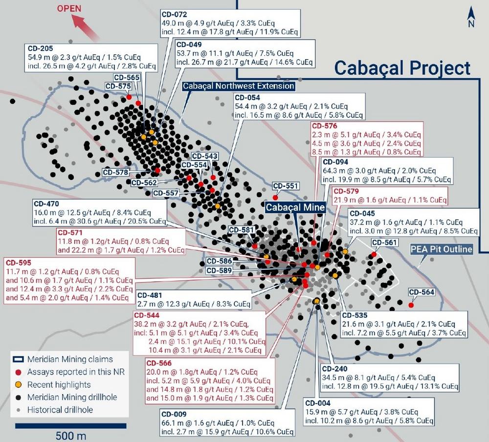 Die Bohrungen in der südlichen, mittleren und östlichen Kupferzone der Lagerstätte Cabaçal lieferten gute Ergebnisse. Zu den bemerkenswerten Ergebnissen zählt das Bohrloch CD-544 in der südlichen Kupferzone ("SCZ"), das drei Abbauhohlräume durchquerte, jedoch sehr starke Cu-Au-Ergebnisse oberhalb und zwischen den historischen Abbauebenen lieferte. Die Hauptmineralisierungszone ergab 38,2 m mit 3,2 g/t AuEq / 2,1 % CuEq auf 78,9 m. Das Bohrloch enthielt mehrere Zonen oberhalb des historischen Untertage-Bergbau-Cutoff-Gehalts von 3 g/t Au (einschließlich 5,1 m @ 4,7 g/t Au, 0,3 % Cu & 1,2 g/t Ag von 84,8 m, 2,4 m @ 14,9 g/t Au, 0,2 % Cu, 1,2 g/t Ag von 92,6 m, 4,8 m @ 3,0 g/t Au, 0,9 % Cu & 2,3 g/t Ag von 114,1 m). Die Mineralisierung unterhalb von 112,5 m in CD-544 setzte sich unterhalb der unteren Grenze von zwei historischen Bohrlöchern (JUSPD407, JUSPD409) fort, die beendet wurden, ohne die gesamte Minensequenz zu durchqueren.