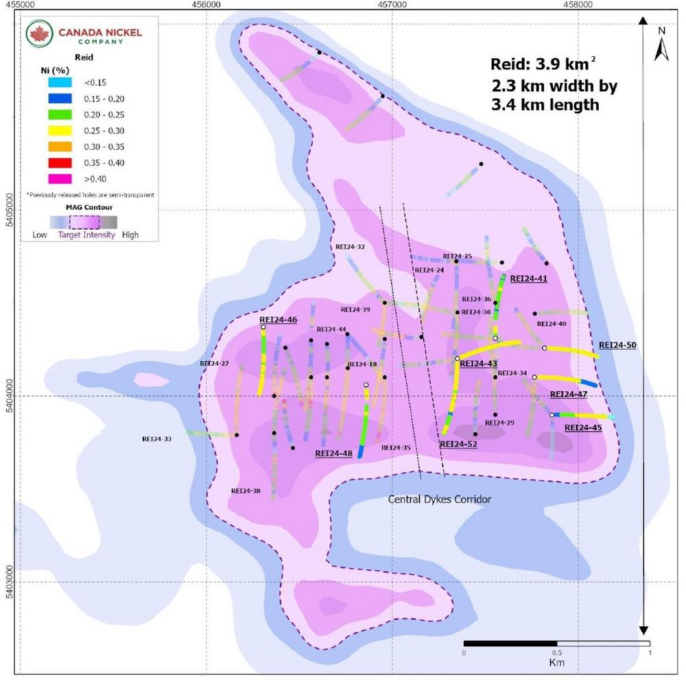 Canada Nickel hat im Rahmen seines Bohrprogramms 2024 bei Reid 26.061 Meter aus 41 Löchern gebohrt. Die Bohrkampagnen 2023 und 2024 haben einen mineralisierten ultramafischen Körper mit einer Streichlänge von 2,2 Kilometern und einer Breite von bis zu 1,0 Kilometern und bis zu einer Tiefe von 650 Metern innerhalb des zentralen Kerns des geophysikalischen Fußabdrucks des Ziels mit insgesamt 32.893 Metern in 57 Bohrlöchern abgegrenzt. Die Anomalie ist nach Norden, Süden und in der Tiefe weiterhin offen (siehe Abbildung 1).