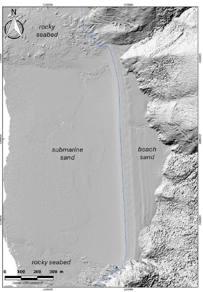 LiDAR ist eine Fernerkundungstechnologie, die Vegetation und Wasser durchdringt und detaillierte 3D-Bilder der Erdoberfläche über und unter Wasser erzeugt. Die Untersuchung des untenstehenden schwarz-weißen LiDAR-Bildes[1] (Abbildung 1), das den Strand von Nonza und den Meeresboden unmittelbar westlich des Strandes zeigt, deutet auf eine deutlich unterschiedliche Unterwassertopografie vor dem Strand hin. Man kann sehen, dass die Unterwassergebiete im Norden und Süden eine unregelmäßige Topografie aufweisen, die auf felsigen Meeresboden zurückzuführen ist. Der Meeresboden westlich des Strandes ist größtenteils glatt; die Vertiefungen wurden mit Sand aufgefüllt. Wie historische Luftbilder (Abbildung 2) zeigen, wird angenommen, dass der Abraum aus der historischen Canari-Mine, der den Hafen von Nonza aufgefüllt hatte, auch den Meeresboden an den Stränden von Albo und Nonza aufgefüllt und bedeckt hat.