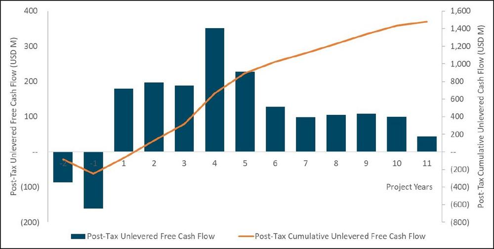 Die gesamten Cash-Kosten spiegeln die Produktionskosten wider. Die in der PFS ausgewiesenen gesamten Cash-Kosten umfassen Abbaukosten, Kosten für Verarbeitung und Wasseraufbereitung, allgemeine und Verwaltungskosten der Mine, externe Kosten, Raffinierungskosten, Transportkosten und Lizenzgebühren. Die gesamten Cash-Kosten pro Unze werden berechnet, indem die gesamten Cash-Kosten durch die zahlbaren Goldunzen geteilt werden.