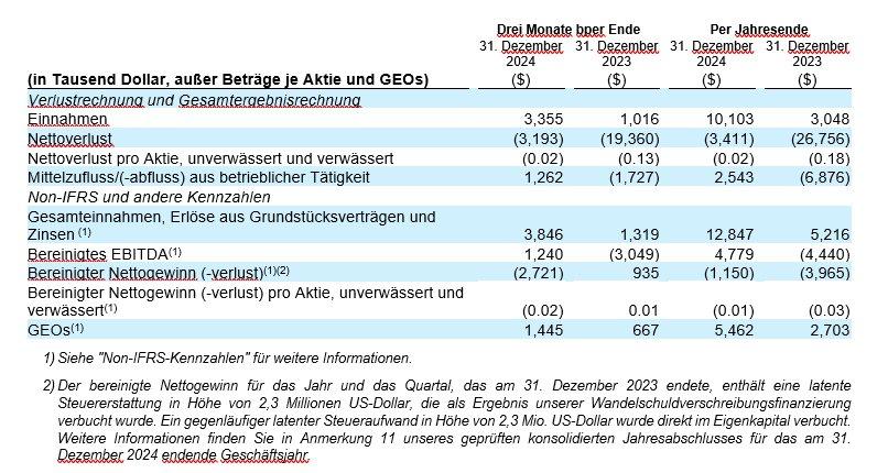 *Gesamtumsatz, Erlöse aus Grundstücksverträgen und Zinsen, bereinigtes EBITDA, bereinigter Nettogewinn (-verlust), bereinigter Nettogewinn (-verlust) pro Aktie und GEOs sind jeweils Non-IFRS-Kennzahlen und haben keine standardisierte Bedeutung gemäß IFRS. Siehe "Non-IFRS-Kennzahlen" für weitere Informationen.