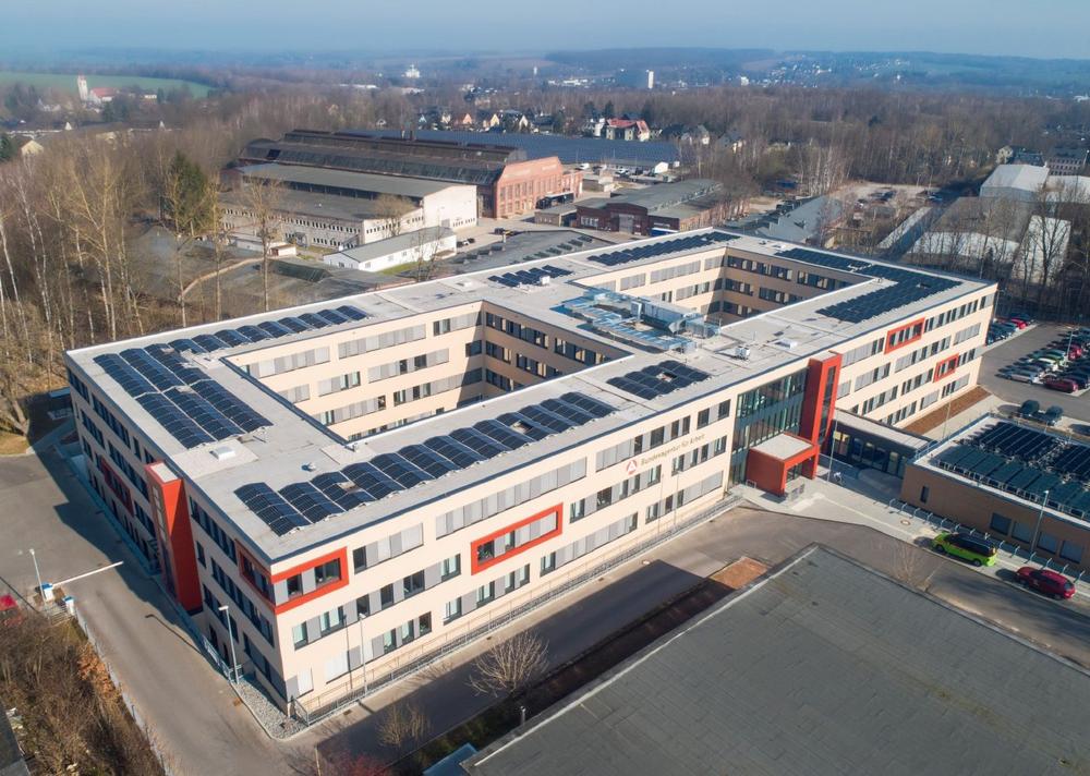 Das Steuerbüro in Solingen wurde in einer rekordverdächtigen Zeit von nur vier Monaten errichtet und erhielt die DGNB-Zertifizierung in Silber sowie eine QNG-Förderung, begünstigt durch die Verwendung nachhaltiger Baumaterialien, eine hohe Energieeffizienz und eine geringe CO₂-Bilanz über den gesamten Lebenszyklus des Gebäudes. Das 2-geschossige Modulgebäude wurde in 4 Monaten ab Modulstellung mit einer Bruttogeschossfläche von 741m² errichtet. Einen Kontrast zur weißen Putz-Fassade setzt das Meldorfer Klinkersystem in einem warmen rot-braunen Ton, das für den vorderen Gebäudeteil verwendet wurde. Das Gebäude beeindruckt durch die von „Architekten vor Ort“ durchdachte Lichtplanung, den flexiblen Einsatz der Büroräume und die hohe Energieeffizienz u. a. dank Photovoltaikanlage. Die extensive Dachbegrünung fördert die Wärmeregulierung und schafft gleichzeitig neuen Lebensraum. - Agentur für Arbeit Chemnitz