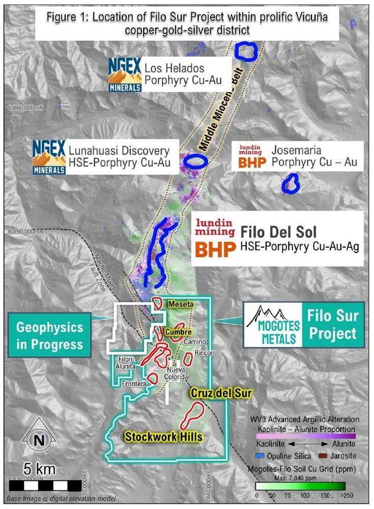 Mogotes Metals Inc. ist ein Mineralexplorationsunternehmen, das im aussichtsreichen Bezirk Vicuña in Argentinien und Chile nach Kupfer und Gold exploriert. Das Vorzeigeprojekt von Mogotes, Filo Sur, grenzt an die Kupfer-Gold-Silber-Entdeckung Filo del Sol und liegt entlang eines von Norden nach Süden verlaufenden Gürtels mit den Kupfer-Gold-Lagerstätten Filo Del Sol – Aurora und NGEx Minerals Lunahuasi und Los Helados.
