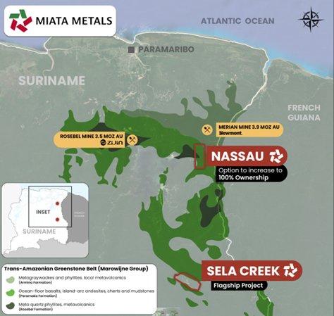 "Mit dieser Transaktion verfügt Miata nun über das Potenzial, sowohl Sela Creek als auch Nassau zu 100 % zu besitzen, wodurch wir die volle strategische Kontrolle über unser Goldportfolio in Suriname haben", sagte Dr. Jacob Verbaas, CEO von Miata. "Wir treiben unser Vorzeige-Goldprojekt Sela Creek weiter systematisch voran, wo unser technisches Team ein großflächiges orogenes System auf 215 km² durch Bohrungen erprobt. Wir freuen uns, dieses Abkommen bei Nassau abzuschließen, da es unsere langfristige Position in den produktiven Grünsteingürteln von Suriname stärkt. Nassau liegt in einer Linie mit den produzierenden Minen Rosebel und Merian*, ist über eine Straße erreichbar und liegt in der Nähe einer wichtigen Infrastruktur. Wie Sela Creek glauben wir, dass auch das Projekt Nassau nun die richtige Grundlage hat, um einen dauerhaften Wert für unsere Aktionäre in Surinames vielversprechendem Goldgürtel aufzubauen."