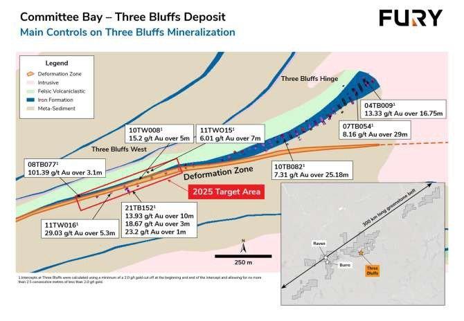 Das Projekt Committee Bay erstreckt sich über den gesamten 300 km langen Grünsteingürtel Committee Bay in der östlichen Region Kitikmeot in Nunavut. Das Landpaket umfasst eine Reihe von Mineralien-Claims und Pachtverträgen, die sich über etwa 250.000 Hektar erstrecken und die Goldlagerstätte Three Bluffs, mehr als fünf fortgeschrittene Goldziele und mehrere bedeutende Goldanomalien einschließen. Die hochgradige Goldlagerstätte Three Bluffs befindet sich in der Mitte des Projekts und enthält schätzungsweise 524.000 Unzen Gold mit einem Gehalt von 7,85 g/t Gold in der angezeigten Mineralressourcenkategorie und 720.000 Unzen Gold mit einem Gehalt von 7,64 g/t Gold in der abgeleiteten Mineralressourcenkategorie (siehe Bericht Committee Bay NI43-101 "Technical Report on the Committee Bay Project, Nunavut Territory, Canada" vom 11. September 2023). Bei den Bohrungen im Jahr 2021 bei Three Bluffs wurden 3 Mineralisierungszonen durchschnitten: 13,93 g/t Gold über 10 m; 18,67 g/t Gold über 3 m; und 23,2 g/t Gold über 1 m. Die beiden erstgenannten Abschnitte liegen außerhalb der Haupteisenformation in abgescherten Metasedimenten, wobei das Gold an den Scheitelpunkten der Zerklüftungen vorkommt. Die scherhaltige Mineralisierung verläuft subparallel zur Haupteisenformation (Abbildung 1) und war in der Vergangenheit kein Schwerpunkt der Exploration. Der Abschnitt von 2021 liegt 250 m unter der Oberfläche und ist sowohl neigungsaufwärts und neigungsabwärts als auch entlang des Streichens in beide Richtungen offen. Die Bohrungen im Jahr 2025 werden fünf bis sechs 100 bis 200 m lange Step-outs vom Abschnitt 2021 auf insgesamt etwa 2.250 m anpeilen (Abbildung 2).