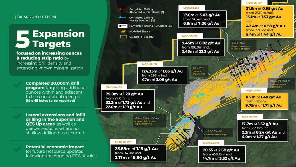 MQD-25-155 und MQD-25-157 wurden niedergebracht, um das Ziel QES Up zu überprüfen, das die Erweiterung der tiefer modellierten mineralisierten Scherzonen entlang der nördlichen Grenze der Zone QES in Richtung Oberfläche nachweisen soll. Das anvisierte Gebiet liegt vollständig innerhalb des konzeptionellen Tagebaus, wobei alle mineralisierten Durchteufungen die Möglichkeit bieten, den derzeit modellierten Abraum in Mineralressourcen umzuwandeln. Beide Bohrungen wurden durch die gesamte Zone QES verlängert, wo sie Lücken in den bestehenden Bohrungen auffüllten. MQD-25-159 zielte auf eine potenzielle nördliche Erweiterung der primären Zone QES ab.