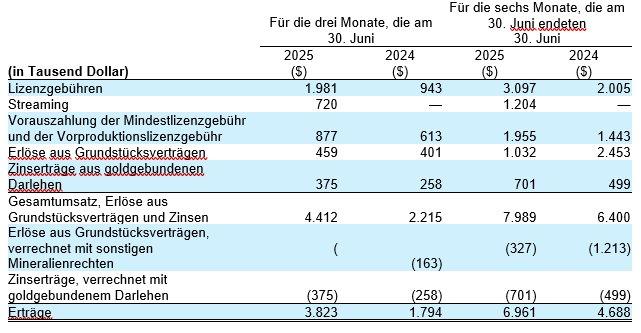 Gold Royalty hat im zweiten Quartal und im ersten Halbjahr 2025 einen Rekordumsatz sowie einen Rekordwert für den Gesamtumsatz, die Erlöse aus Landvereinbarungen und die Zinsen* erzielt. $Der Gesamtumsatz, die Erlöse aus Landverträgen und die Zinsen* stiegen im zweiten Quartal 2025 um ca. 100 % auf 4,4 Millionen US-Dollar (Umsatz von 3,8 Millionen US-Dollar) gegenüber dem zweiten Quartal 2024, was 1.346 Goldäquivalentunzen („GEOs”)* entspricht. In der ersten Hälfte des Jahres 2025 stiegen der Gesamtumsatz, die Erlöse aus Landverträgen und die Zinsen ebenfalls um 25 % gegenüber dem gleichen Zeitraum des Jahres 2024 auf einen Rekordwert von 8,0 Millionen Dollar (Umsatz von 6,9 Millionen Dollar), was 2.595 GEOs entspricht.