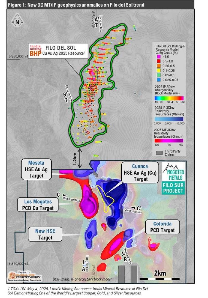 - Die geophysikalische Anomalie Los Mogotes befindet sich direkt im Trend, 2,5 km südlich der Grenze der BHP/Lundin-FDS-Ressource, die noch offen ist1 und in Richtung der Mogotes-Claims weiterbohrt.