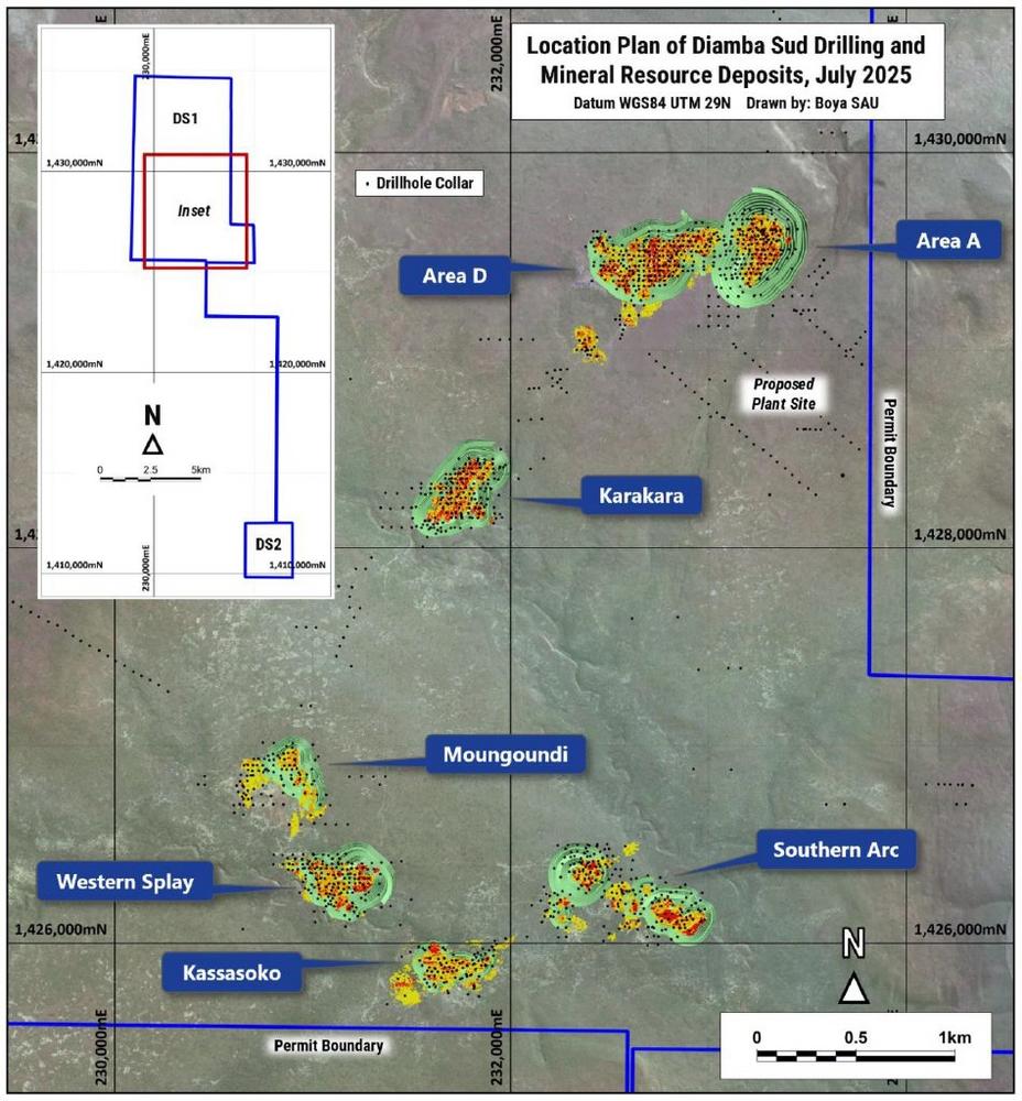 Die aktualisierte Mineralressourcenschätzung basiert auf neuen Bohrungen, die zwischen Juli 2024 und Juli 2025 abgeschlossen wurden und 243 Bohrlöcher mit einer Gesamtlänge von 31.652 Metern. Die gesammelten Daten verbesserten die geologische Interpretation und die Ressourcenmodellierung für die Gebiete A, D, Karakara, Western Splay und Kassassoko. Sie trugen auch zur Erweiterung der Pipeline von Diamba Sud mit neuen Lagerstätten bei, wobei erstmals Ressourcenschätzungen für Southern Arc und Moungoundi vorgenommen wurden. Erweiterungsbohrungen in diesen Lagerstätten sowie Bohrungen in neuen Zielgebieten sind für das vierte Quartal 2025 geplant.