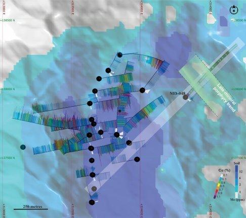 Die Bohrung MD-048 ist die erste Bohrung, die im Zielgebiet East Valley niedergebracht wurde, einem bisher nicht untersuchten Gebiet, das weit außerhalb der aktuellen Ressource des Porphyr-Kupfer-Molybdän-Projekts Mocoa liegt. Die Bohrung wurde konzipiert, um eine Cu-Mo-Anomalie im Boden und Gestein (siehe Abbildung 1) zu überprüfen, und wurde im Rahmen des laufenden 14.000 Meter umfassenden Programms von Copper Giant zur Erweiterung der Ressource bis in eine Tiefe von 785,3 Metern niedergebracht.