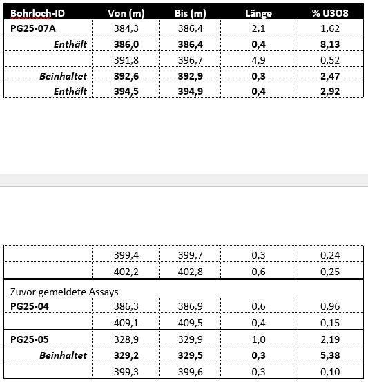 • Bohrloch PG25-07A durchteufte 0,4 Meter mit 8,1 % U₃O₈ innerhalb von 2,1 Metern mit 1,6 % U₃O₈ in der Entdeckungszone Nova. Das Bohrloch ergab außerdem weitere 4,9 Meter mit 0,52 % U₃O₈, darunter 0,4 Meter mit 2,9 % U₃O₈.