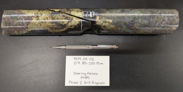 Das Ziel MEPS wurde aufgrund seiner Oberflächenmineralisierung beim Vorkommen Cave ausgewählt, wo Sterling Metals im Jahr 2024 Erzgänge mit bis zu 15,9 % Cu erprobt hat (siehe Pressemitteilung vom 29. Oktober 2024), sowie aufgrund seiner Übereinstimmung mit einem umfassenden Tiefstwert der Widerstandsmessung und seiner Nähe zum GFP-Porphyr, der im Rahmen von Phase 1 (Bohrloch MJ-25-01) entdeckt worden war. Das erste Bohrloch, das bei MEPS gebohrt wurde, lieferte bedeutsame geologische Informationen, verfeinerte die Interpretation des mineralisierten Abschnitts und dient als Leitfaden für Anpassungen der weiteren Bohrwinkel.