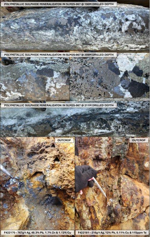 –          Die Bohrung SLM25-068 zielte auf eine Reihe von silberreichen Galenit-Pyrit-Tafelgängen ab, die in einer kretazischen mafischen Intrusion beherbergt sind, und durchteufte erfolgreich eine mäßig bis sehr dichte Gangbildung über 32 m. Oberflächenproben, die an dieser Stelle im Jahr 2024 entnommen wurden, enthielten 216 g/t Ag, 12 % Pb, 0,11 % Cu und 115 ppm Te (F422181).