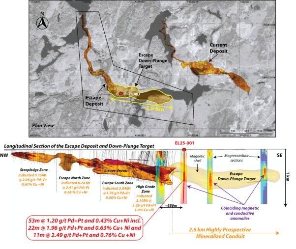 Im Sommer 2025 schloss das Unternehmen sein erstes Bohrloch (EL25-001) innerhalb der geplanten Abwärtserweiterung der Lagerstätte Escape ab. Die modellierte Erweiterung basiert weitestgehend auf 3D-Magnetik-Inversionsdaten, die zeigen, dass die Lagerstätte Escape und das Erweiterungsziel Teil einer einzelnen, gewundenen bis linearen magnetischen Anomalie sind, die aus alteriertem ultramafischem Gestein stammt, das die Lagerstätte Escape beherbergt. Die Erweiterung weist auch lokale Leitfähigkeitsanomalien auf (Abbildung 1), die für Bohrungen von unmittelbarem Interesse sind. Bohrloch EL25-001 erprobte eine dieser übereinstimmenden Magnetik- und Leitfähigkeitsanomalien, genauer gesagt eine übereinstimmende „Ballroom“-artigeAnomalie, die jenen hochgradigen „Ballroom“-Strukturen ähnlich ist, die kürzlich in der Lagerstätte Current durchschnitten wurden (siehe Pressemitteilung vom 15. April 2025).