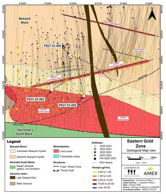 Aaron Stone, P.Geo, Vice President Exploration von Amex Exploration, sagte: „Das geomechanische Programm wurde mit dem primären Ziel konzipiert, Informationen über alle Aspekte der Gesteinsmechanik im Umfeld der hochgradigen Zone Champagne zu sammeln, die gemäß unserer jüngsten PEA-Studie für einen gebührenpflichtigen Abbau vorgesehen ist. Diese Bohrlöcher wurden konzipiert, um die wichtigen Strukturen innerhalb und im Umfeld der Zone Champagne bestmöglich zu durchteufen, und wurden nicht zwangsläufig in bedeutsamen Mineralisierungszonen platziert. Die Tatsache, dass PEGT-25-001 den bis dato hochgradigsten Wert im Konzessionsgebiet geliefert hat, ist daher außergewöhnlich. Es ist auch wichtig zu beachten, dass wir beschlossen haben, den gesamten Kern zur Analyse einzusenden, zumal wir über umfassende Analysedaten in den Gebieten im Umfeld der geomechanischen Bohrungen verfügten. Eine Analyse des gesamten Kerns liefert ein realistischeres Bild der Mineralisierung, weshalb es äußerst vielversprechend ist, die anhaltende Robustheit der hochgradigen Zone zu beobachten.“