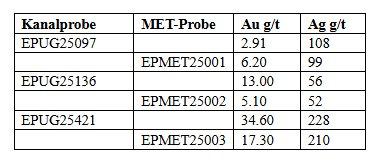 Die Pinos Cuates Mine ist die zentrale Mine der drei historischen Abbaustätten im epithermalen, gering sulfidierten Dos de Mayo Adersystem bei El Potrero. Die drei metallurgischen Proben wurden auf der Grundlage der Ergebnisse früherer Kanalproben aus dem Stollen und dem oberen Bereich der Mine entnommen. Jede Probe wog etwa 25 kg. Die Proben wurden mittels Feuerprobe mit AAS-Abschluss auf Gold und Silber untersucht, doppelt durchgeführt und mittels 4-Säure-Aufschluss und ICP-Abschluss auf 32 Elemente analysiert. Letztere bestätigten, dass nur vernachlässigbare Mengen an Kupfer, Blei, Zink, Arsen, Quecksilber oder anderen schädlichen Elementen vorhanden sind. Einige Abweichungen zwischen den Goldanalysen der Kanalproben und den metallurgischen Proben deuten auf das Vorhandensein eines Nugget-Effekts hin, der wahrscheinlich auf feines freies Gold zurückzuführen ist, da die Silberanalysen vergleichbar waren. Ein Vergleich der beiden Analysesätze ist in der folgenden Tabelle zu sehen:
