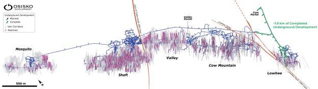 – Bis heute wurden unter Tage Entwicklungsarbeiten von etwa 1,9 Kilometer Länge vom bestehenden Cow-Portal in die Zone Lowhee des Goldprojekts Cariboo und entlang der Hauptzugangsrampe in Richtung der Zone Cow Mountain bis zur Lowhee-Verwerfung fertiggestellt (siehe Abbildung 1).