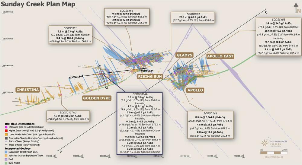 - SDDSC184A lieferte die beiden höchsten jemals bei Golden Dyke gemessenen Einzelgoldgehalte – 986 g/t Au und 416 g/t Au, beide in alteriertem Sediment –, was ein außergewöhnliches Gehaltspotenzial zeigt, das mit Rising Sun vergleichbar ist.