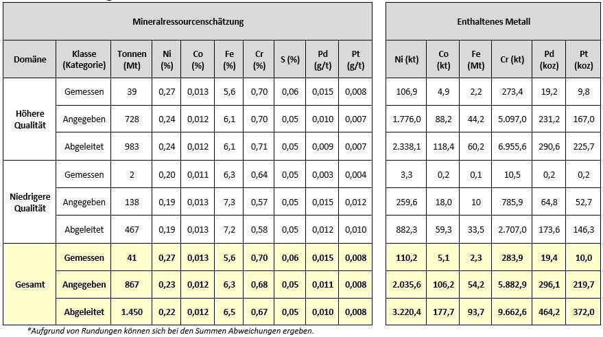 - Gemessene und angezeigte Ressourcen: Anstieg um 46 % auf 2,1 Millionen Tonnen Nickel (0,87 Milliarden Tonnen mit 0,23 % Ni), einschließlich eines höhergradigen Bereichs von 0,77 Milliarden Tonnen mit 0,25 % Ni.