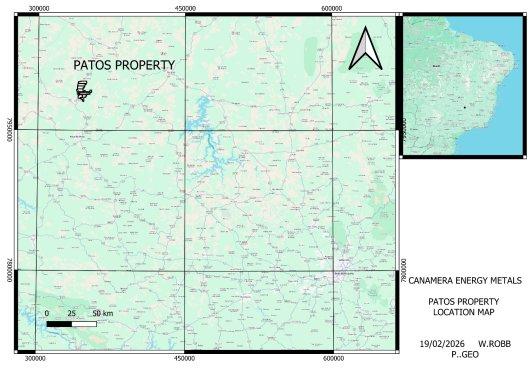 Das Projekt Patos setzt sich aus acht (8) Prospektionslizenzen (ANM Licence IDs: 830763/2024 bis 830771/2024) mit einer Gesamtfläche von rund 15.979 Hektar zusammen und liegt im Gemeindegebiet von Presidente Olegário im brasilianischen Bundesstaat Minas Gerais. Das Konzessionsgebiet ist auf dem Straßenweg erreichbar und rund 330 Kilometer von der Stadt Belo Horizonte entfernt.