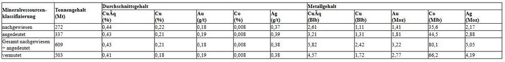 – Die verwendeten wirtschaftlichen Annahmen beinhalten 4,80 US-$/Pfund Cu, 20,00 US-$/Pfund Co, 3.200 US-$/Unze Au, 46 US-$/Unze Ag und eine Nettoschmelzabgabe von 2 %.