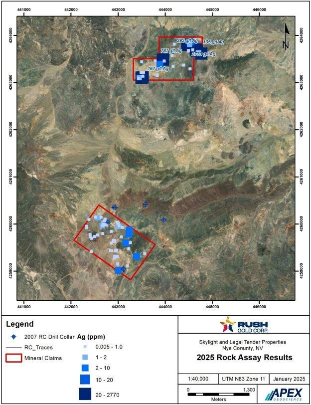 Die geologische Erkundung der Phase 1 im Jahr 2025 wurde konzipiert, um bekannte Gold- und Silber-Gesteinsfunde und aus Satellitendaten abgeleitete Alterationsanomalien vor Ort zu untersuchen (siehe Pressemitteilung des Unternehmens vom 16. Dezember 2025). Die unten zusammengefassten Ergebnisse der geochemischen Gesteinsproben umfassen den bisher höchsten Silbergehalt, der je bei Legal Tender gemessen wurde, sowie die Ausweitung des Goldtrends bei Skylight auf 1,2 km.