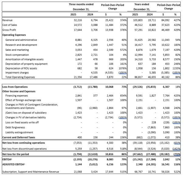 Rekordumsatzwachstum – HEALWELL erzielte im Geschäftsjahr 2025 einen Rekordjahresumsatz aus fortlaufenden Betrieben in Höhe von ca. 103,8 Millionen Dollar. Dies entspricht einem Anstieg um 427 % gegenüber den 19,7 Millionen Dollar im Geschäftsjahr 2024. Das Unternehmen verzeichnete im Geschäftsjahr 2025 einen IFRS-Nettoverlust aus fortlaufenden Betrieben in Höhe von 39,1 Millionen Dollar, verglichen mit einem Nettoverlust von 24 Millionen Dollar im Geschäftsjahr 2024.