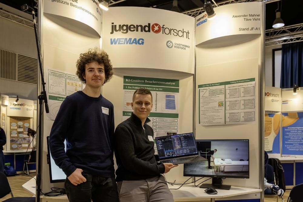 Den 1. Preis im Fachgebiet Arbeitswelt haben Alexander Mahnel und Täve Vieth vom Gerhart-Hauptmann-Gymnasium Wismar erhalten. Ziel des Projekts war die Entwicklung eines lokal arbeitenden, KI-basierten Systems zur anonymisierten Erfassung von Personenströmen in öffentlichen Durchgangsbereichen. Das System nutzt dabei ein neuronales Objekterkennungsmodell in Kombination mit einer speziellen Tracking-Logik. Im Gegensatz zu herkömmlichen Lichtschrankensystemen oder cloudbasierten Kameralösungen erfolgt die Verarbeitung lokal im Arbeitsspeicher, ohne dauerhafte Speicherung von Bilddaten. Dadurch wird eine hohe Zählgenauigkeit bei Minimierung datenschutzrechtlicher Risiken erreicht.