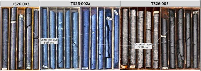 Die geologische Bohrkernprotokollierung zeigte, dass alle drei Bohrlöcher über weite Abschnitte hinweg eine visuell erkennbare Sulfidmineralisierung durchteuft hatten. Zu den beobachteten Sulfidmineralien gehört Chalkopyrit mit vergesellschafteten Sulfiden, die als Einsprengungen und Erzgängchen auf Abschnitten zwischen etwa 100 bis 450 Meter Bohrtiefe vorkommen. Ilmenit, das wichtigste titanhaltige Mineral innerhalb der Ressource Titac South, wird in jedem Bohrloch im gesamten Intrusionsgebiet beobachtet.
