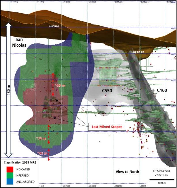 Diese Bohrlöcher bestätigen zusammen mit dem historischen Bohrloch SLP-SN-12-02 (248 g/t AgÄq auf 2,15 m), das von First Majestic niedergebracht wurde, das Vorkommen eines hochgradigen Mineralisierungsblocks, der sich entlang einer Mindeststreichlänge von 45 m mindestens 90 m über die zuletzt bei San Nicolas abgebauten Strossen nach oben hinaus erstreckt. Der hochgradige Block wurde im mit der Vorschrift National Instrument 43-101 – Standards of Disclosure for Mineral Projects („NI 43-101“) konformen technischen Bericht mit dem Titel „Independent Technical Report for the La Parrilla Silver Mine, Durango State, Mexico“ mit Stichtag 24. März 2025 (der „technische Bericht“) als Teil der angedeuteten Ressource eingestuft.