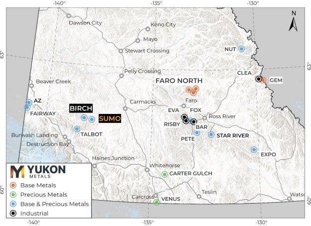 Das Konzessionsgebiet Sumo befindet sich in strategischer Lage im Südwesten des Yukon, rund 10 km östlich des unternehmenseigenen Projekts Birch, und verfügt über direkten Zugang zu regionaler Infrastruktur, darunter eine Straße im Umkreis von 15 km sowie das 37-MW-Wasserkraftwerk Aishihik, das etwa 80 km entfernt entlang desselben Straßenkorridors liegt.