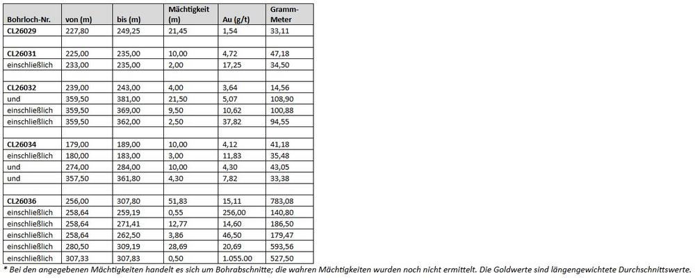 –          Bohrloch CL26036 durchteufte 15,11 g/t Gold (Au) auf 51,83 m ab 256,00 m